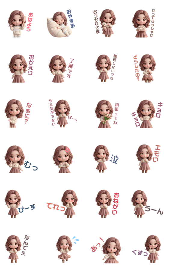 | スタンプ説明 | 3Dのぷにぷに質感がかわいい、淡色系オシャレ女子の日常スタンプです。恋人/カップル/友達/家族/挨拶/リアクション/女の子/AI |