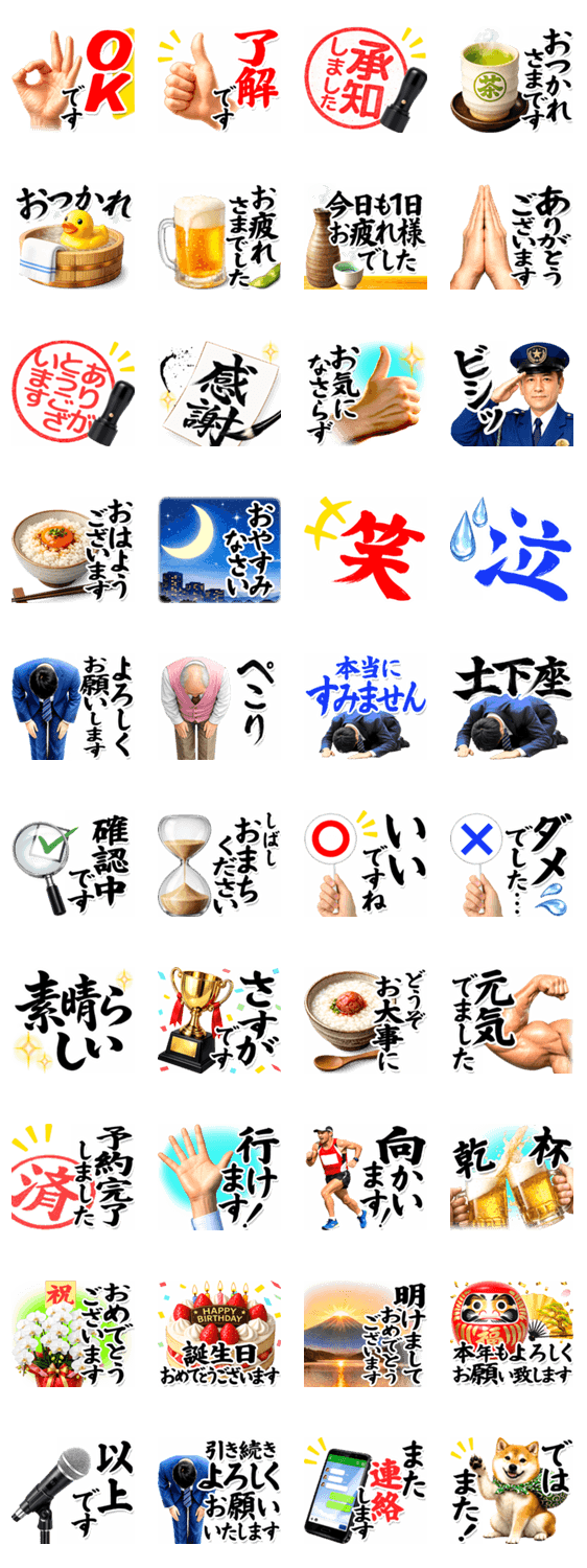 | スタンプ説明 | 日常や仕事で使える、男性ぴったりの敬語LINEスタンプです。 大人シンプル/見やすいデカ文字返事/挨拶/即レス返信/営業ビジネス/サークル/めっちゃ使いやすい/判子/ビール |