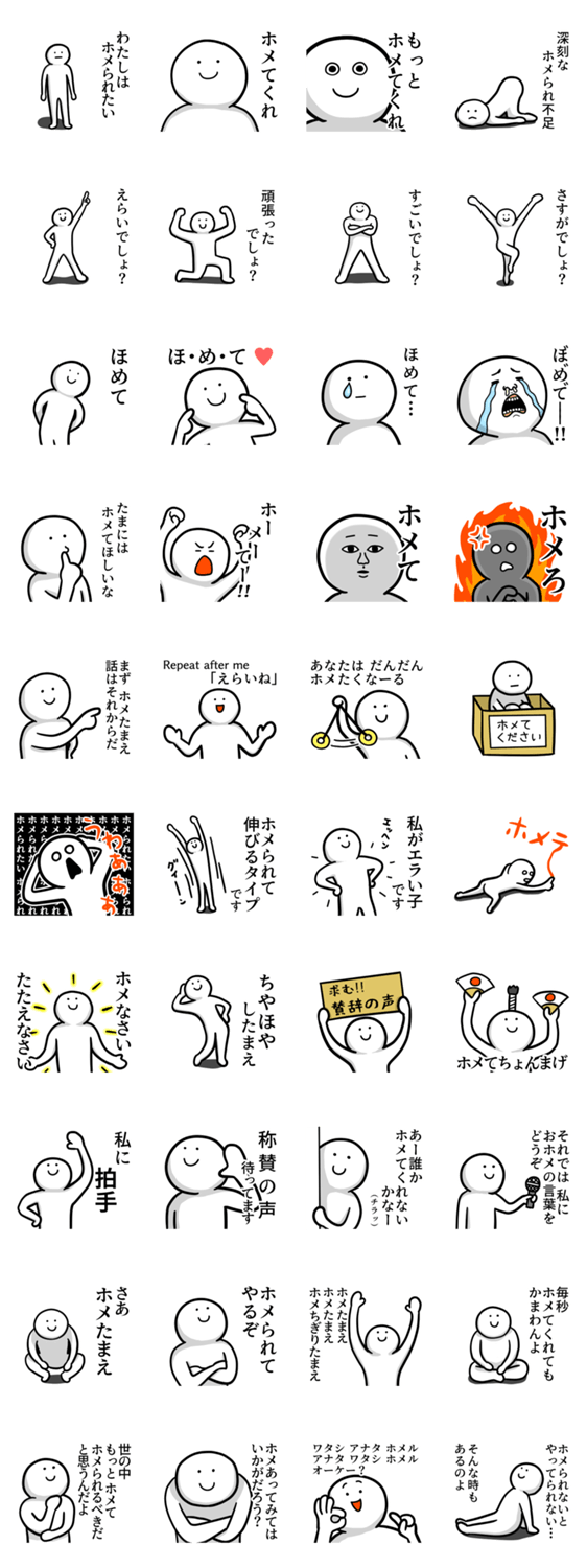 | スタンプ説明 | わたしをホメてくれ。ということで、ひたすらホメを要求するスタンプです。ほめられたい/褒められたい/誉められたい |