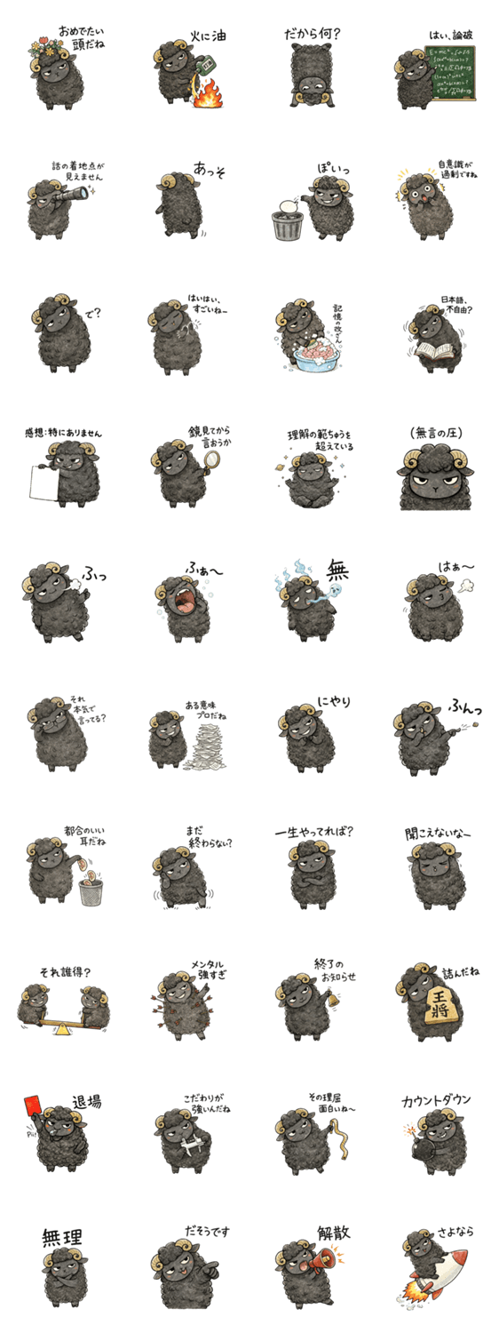 | スタンプ説明 | かわいいんだけど黒い羊!ヒツジ/ひつじ/腹黒/毒舌/いじわる/意地悪/心の声/煽り/シュール/動物/面白い/ネタ/ギャグ/笑える/バカ/アホ/うざい/口の悪い/子生意気/皮肉/爆笑 |
