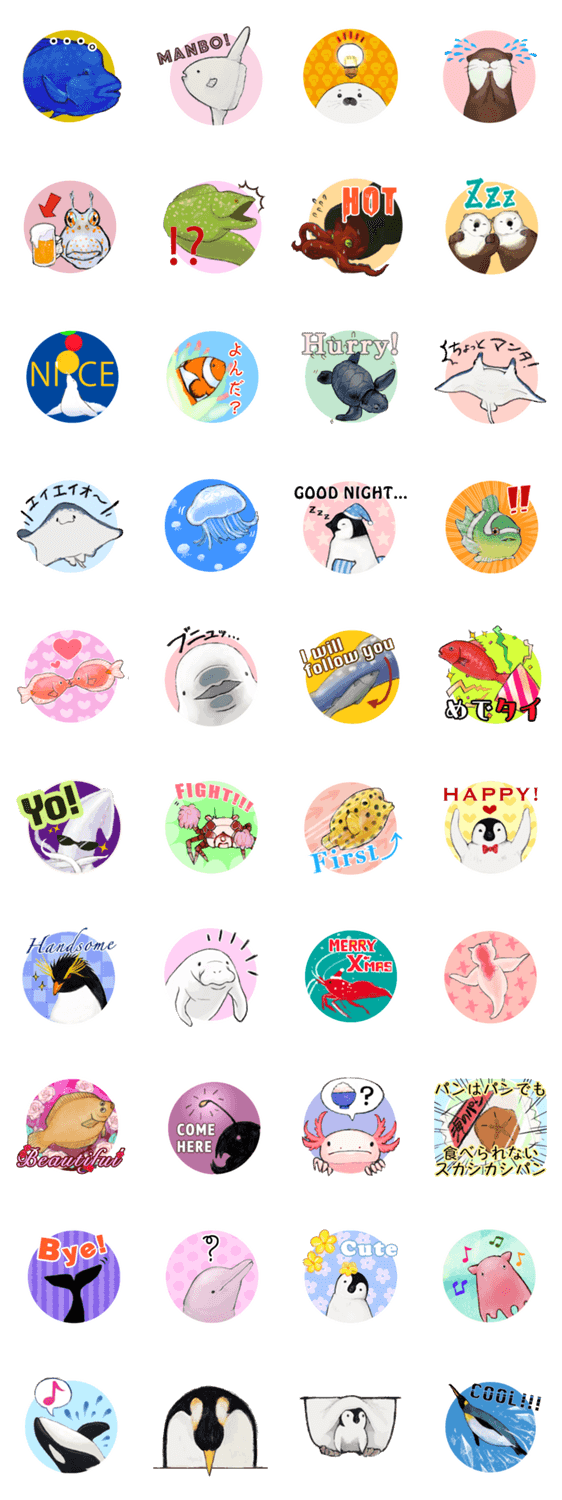 ゆるっとのんびりした海のなかまたちのスタンプです