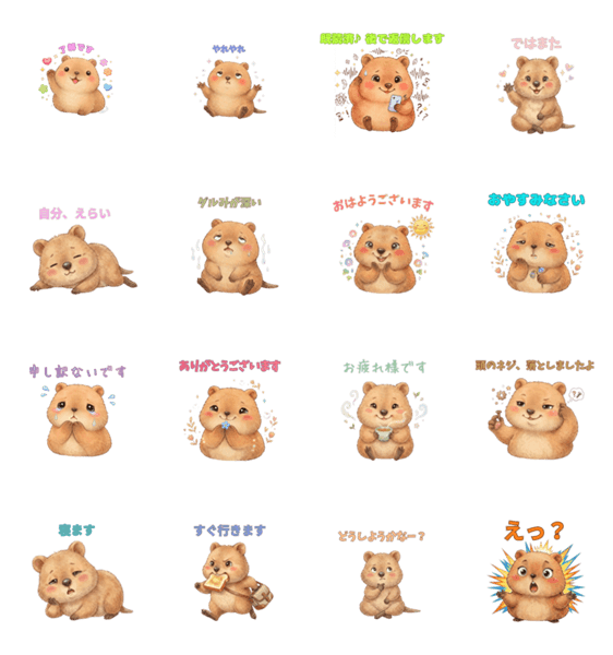 | スタンプ説明 | ゆるくてリアルなかぴばらが、あなたの気持ちを代わりに伝えます。おはよう・おつかれ・ありがとうなど日常で使いやすい言葉入り。がんばらない日も、ちゃんとえらい。 |