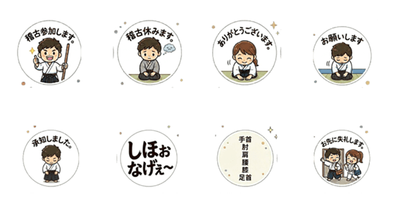 | スタンプ説明 | 合気道をはじめ、様々な武道やスポーツの稽古仲間との連絡に最適なスタンプです。日々の挨拶や稽古の参加確認、日常のやり取りまで幅広くお使いいただけます。 |