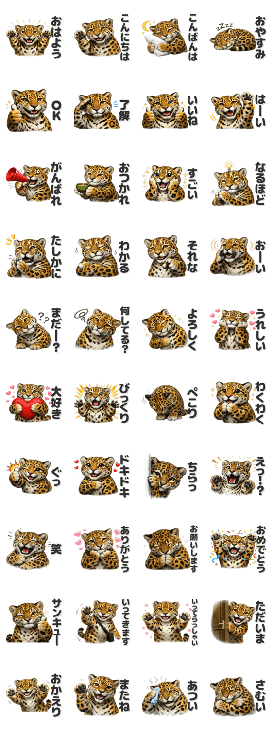| スタンプ説明 | 使いやすいジャガーのスタンプです。/動物/どうぶつ/かわいい/可愛い/シンプル/日常/癒し/見やすい/便利/返事/家族/友達/使いやすい |