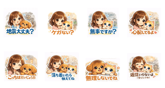| スタンプ説明 | 地震や大雨などの災害時に使える、やさしい安否確認スタンプです。大切な人を気づかう気持ちを、ふわりがやさしく届けます。 |