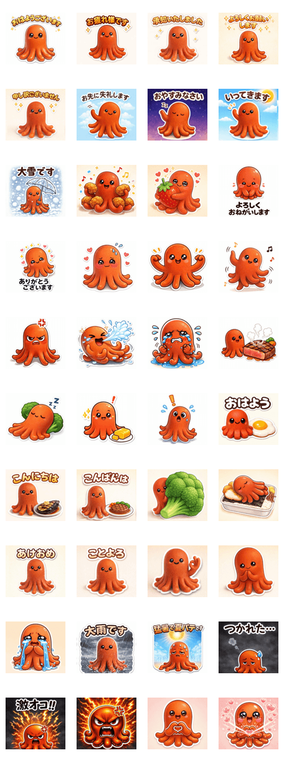 | スタンプ説明 | ず~っと!使い倒せる敬語タコウィンナー。/お弁当/おかず/オカズ/野菜/ブロッコリー/かわいい/可愛い/カワイイ/毎日使える/ずっと使える/大雪/あけおめ/ことよろ/正月 |