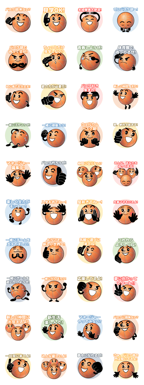 | スタンプ説明 | バスケットボールのキャラクターのスタンプです。新入部員やマネジャーの勧誘、新しい生活が始まるバスケ仲間との連絡にぴったりです。 |