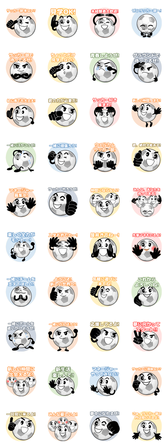 | スタンプ説明 | サッカーボールのキャラクターのスタンプです。新入部員やマネジャーの勧誘、新しい生活が始まるサッカー仲間との連絡にぴったりです。 |