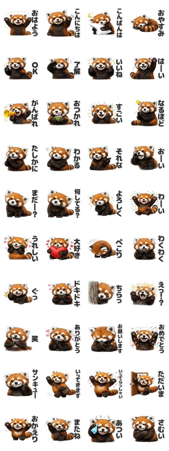 | スタンプ説明 | 可愛いレッサーパンダのスタンプです。/動物/どうぶつ/アニマル/癒し/可愛い/シンプル/便利/返事/家族/友達/見やすい |