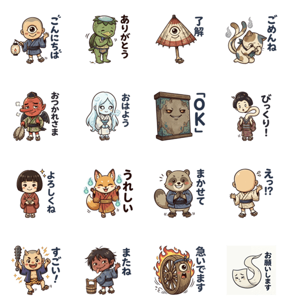 | スタンプ説明 | 一つ目小僧や河童、一反木綿など、和風でレトロかわいい妖怪たちの日常で使いやすいスタンプです。 |