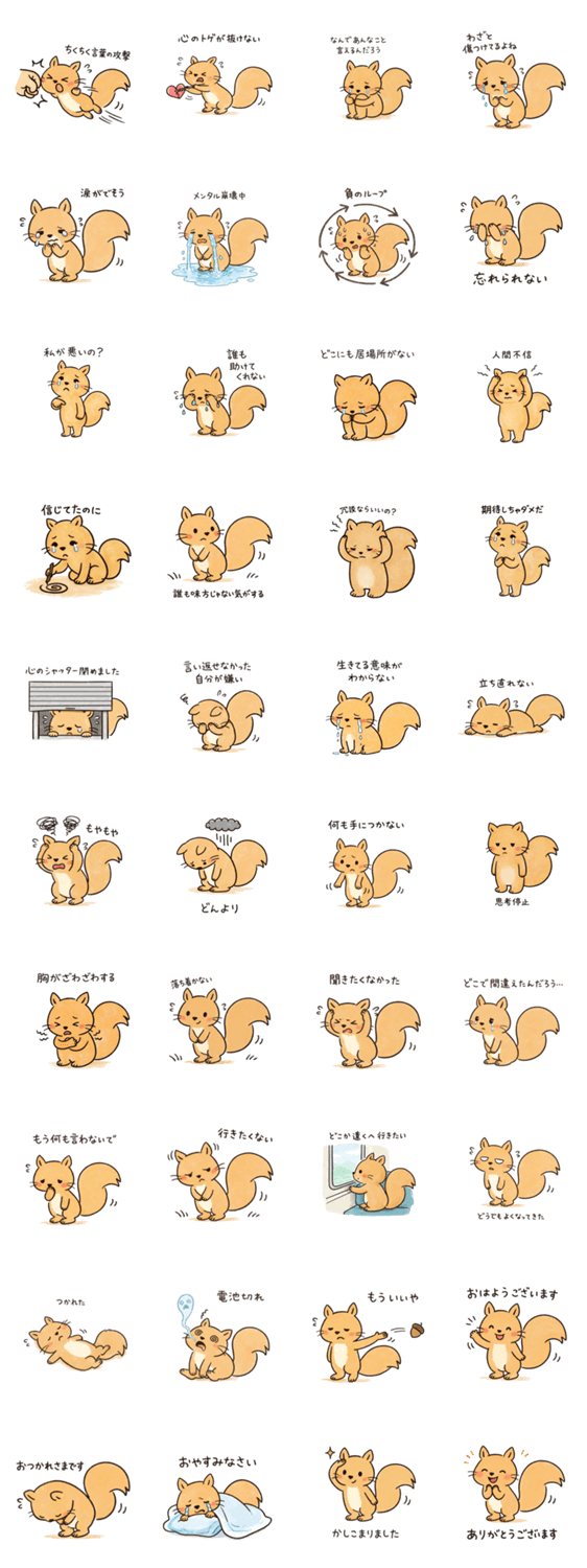 | スタンプ説明 | 人間関係/負のループ/家庭/ストレス/孤独/会社/落ち込む/後ろ向き/無気力/傷心/ショック/精神/豆腐メンタル/脆い/グサリ/刺さる/忘れられない/崩壊/人間不信/もやもや/停止 |