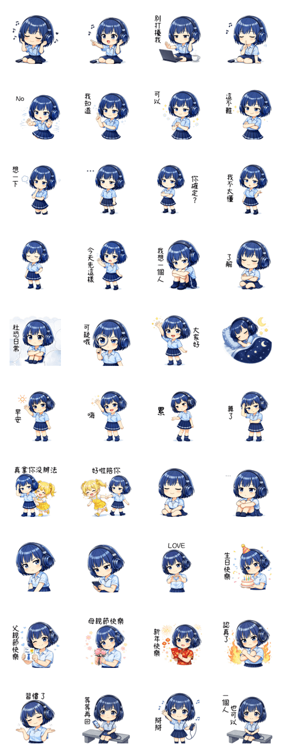 | スタンプ説明 | Angie is a calm blue girl who always wears headphones. Quiet but thoughtful, she has her own gentle strength. |