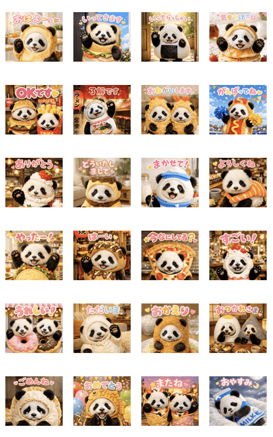 | スタンプ説明 | 可愛いパンダが美味しい食べ物になりきって画面いっぱいに飛び出して動く♪ポップアップスタンプです♡ |