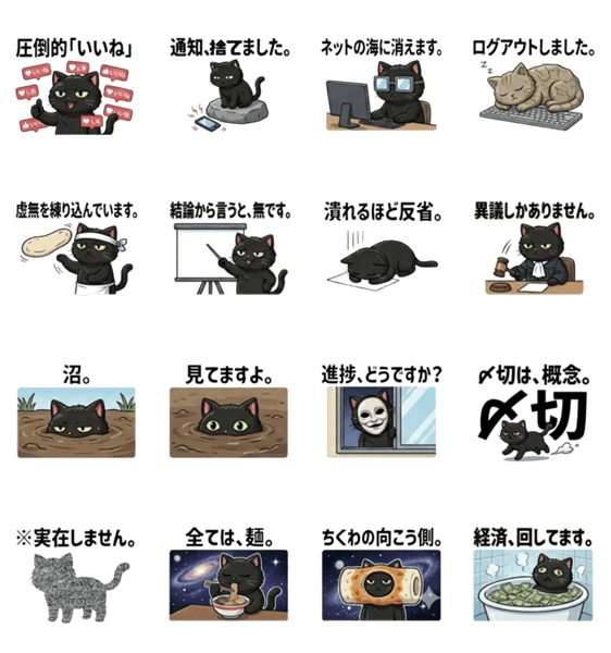 | スタンプ説明 | 虚無の向こう側へ。SNSの闇や沼、ちくわの穴の宇宙まで、猫を超え概念化した虚無猫が現代の歪みをシュールに笑いへ変えるスタンプ。 |