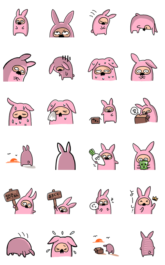 | スタンプ説明 | 商店街でひっそり頑張る、 うさぎのきぐるみを着た八百屋のおじさん。 無口で人見知りな「うさじじ」です。 |