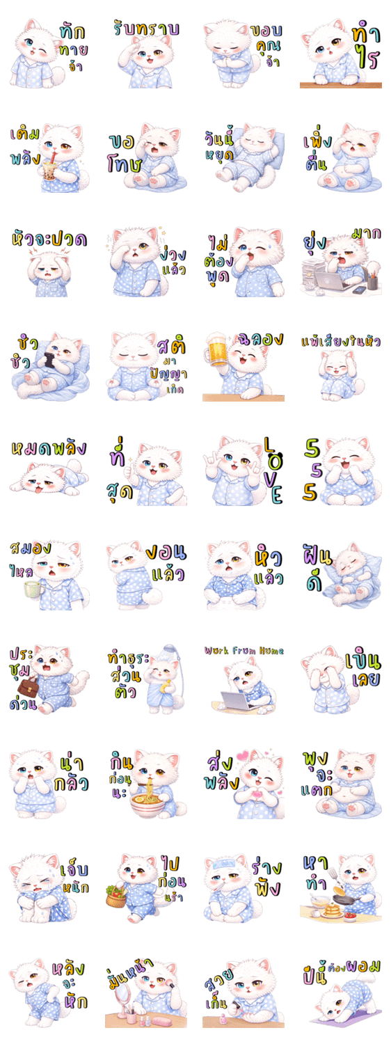 | スタンプ説明 | NooHeng, a cute fluffy white cat in blue pajamas, shows daily life moods eating, sleeping, working. Perfect for chatting with friends and family every day. |