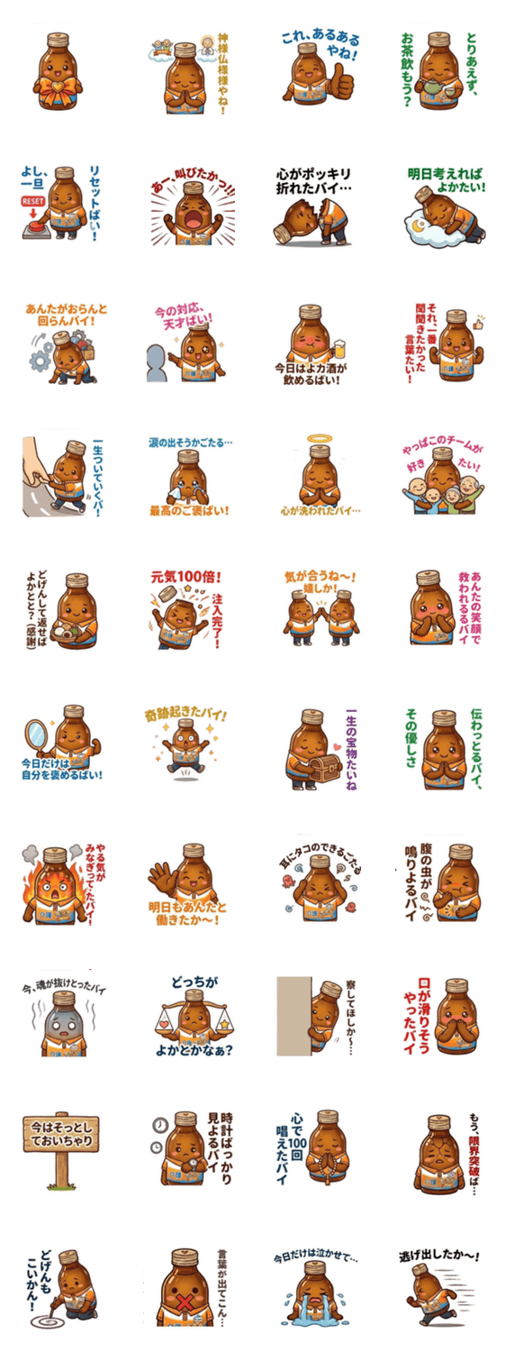 | スタンプ説明 | 栄養ドリンク「よかビン」第2弾!現場で働くみんなの本音を代弁します。真面目な顔して心の叫びを漏らすシュールなスタンプで、仕事仲間と疲れを笑い飛ばしましょう! |