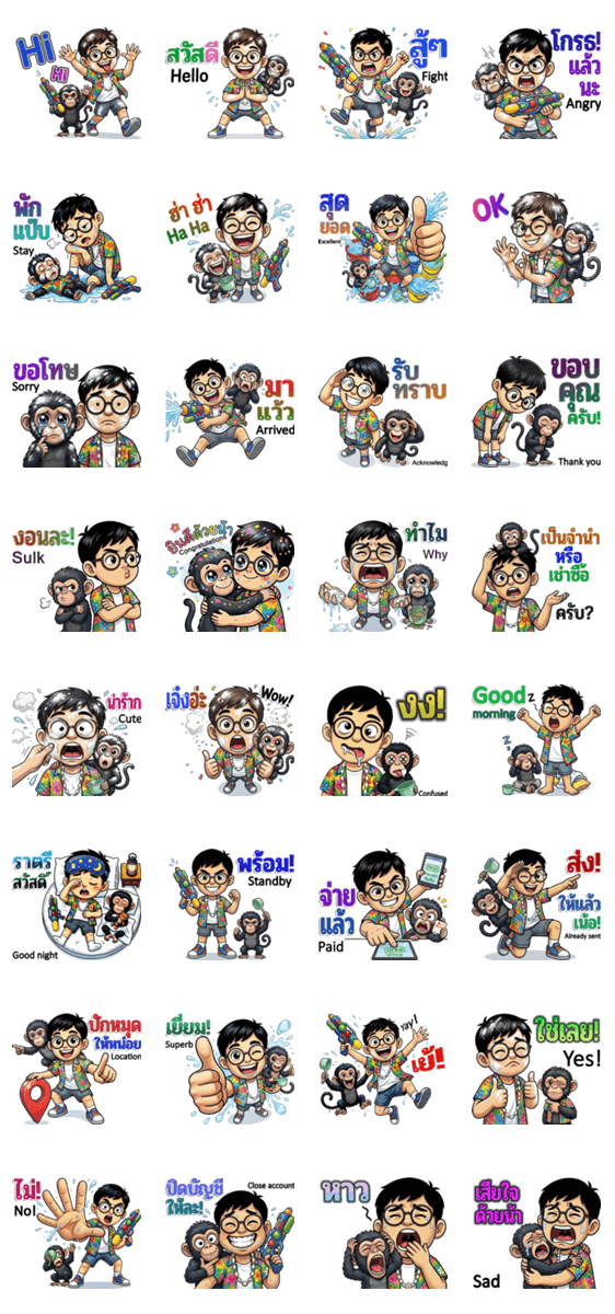 | スタンプ説明 | The bespectacled kid and the mischievous little monkey cause chaos during Songkran. |