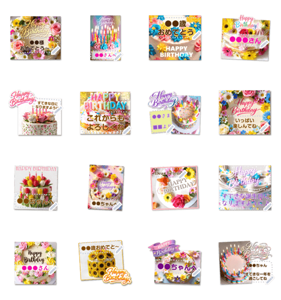 | スタンプ説明 | 空欄に文章入力できる!お花や生クリーム・アイシングがキラキラ♡カラフルポップ&キュートなボタニカルなバースデーケーキのメッセージスタンプです♪ 現在この商品は一部のスマートフォン版LINE 10.3.0以上のトークルームでのみ使用できます。動作環境の最新情報はヘルプをご確認ください。 |