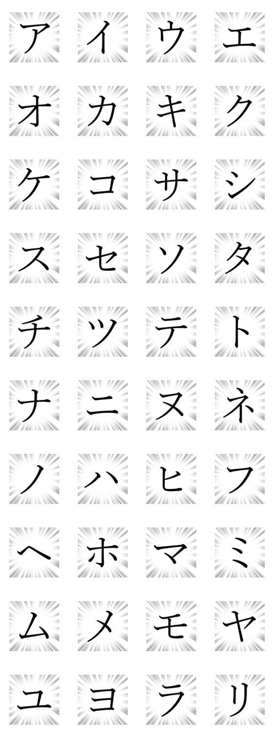 | スタンプ説明 | ア~リまでの片仮名スタンプです。50音順/漫画の集中線、効果線風/アイウエオ・カキクケコ・サシスセソ・タチツテト・ナニヌネノ・ハヒフヘホ・マミムメモ・ヤユヨ・ラリ |