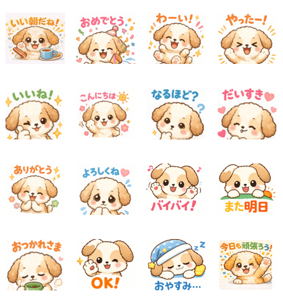 | スタンプ説明 | A set of adorable puppy stickers for daily chats. Perfect for greetings, thanks, love, and encouragement. Easy to use and full of warmth. |