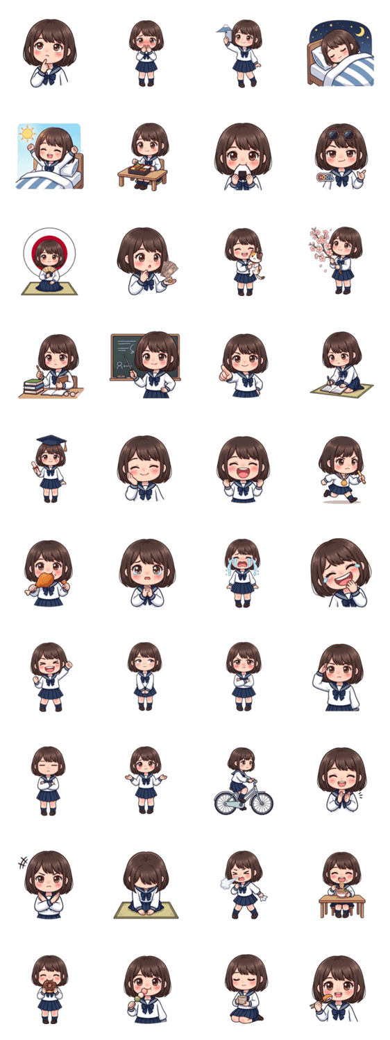 | スタンプ説明 | a cute school girl cheerful hardworking and a bit playful She shows many moods perfect for everyday chats |