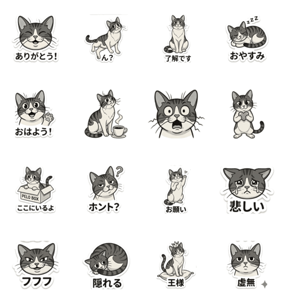 | スタンプ説明 | 保護ネコのキジシロ、ペロちゃんの日常使いスタンプ |