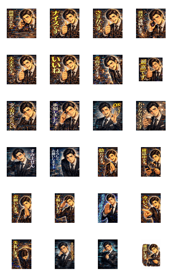 | スタンプ説明 | 仕事・日常・本音まで使えるスーツ男子スタンプ。 喜び・焦り・謝罪・応援など大人の感情をリアルに表現。 ビジネスでも普段使いでも活躍する使いやすい24種類。 |