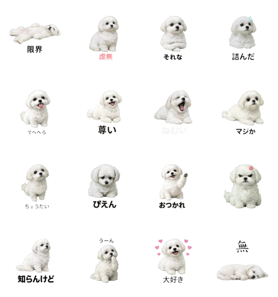 | スタンプ説明 | 白くてふわふわ、見た目は天使。でも中身はちょっとお疲れ気味? 現代社会をたくましく(?)生き抜くマルチーズの実写スタンプが登場! |