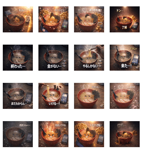| スタンプ説明 | どん底から人生逆転までを描いたラーメンスタンプ。無理、終わった…から始まり、ありがとう・しあわせ・人生大逆転まで。仕事や日常で使える16種類。 |