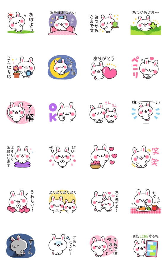 | スタンプ説明 | 友達や家族、恋人に♪人を選ばず普段使いしやすい、優しくて可愛いうさぎさんでのスタンプです! (毎日連絡/日常挨拶) |