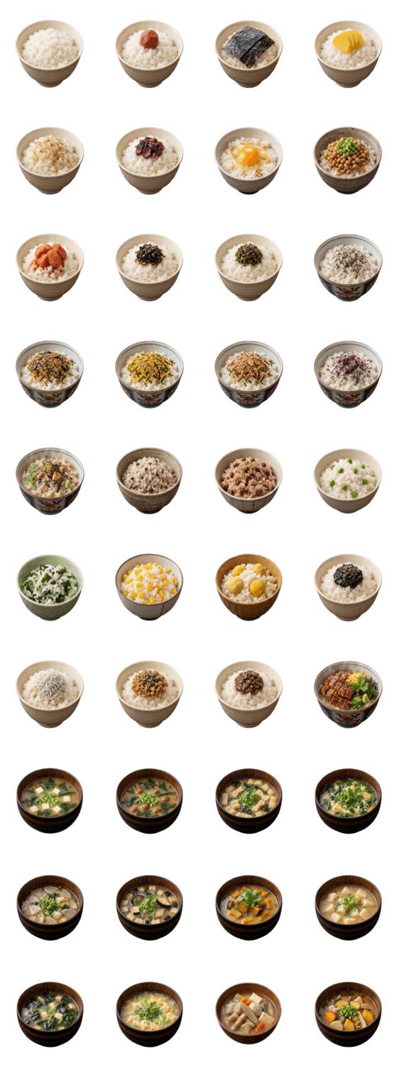| スタンプ説明 | 実写みたいなお米と味噌汁。白米・梅干し・味海苔・たくわん・鰹節・柴漬け・卵かけご飯・納豆・明太子・昆布・高菜・ふりかけ・お茶漬け・赤飯・豆・わかめ・佃煮・しらす |