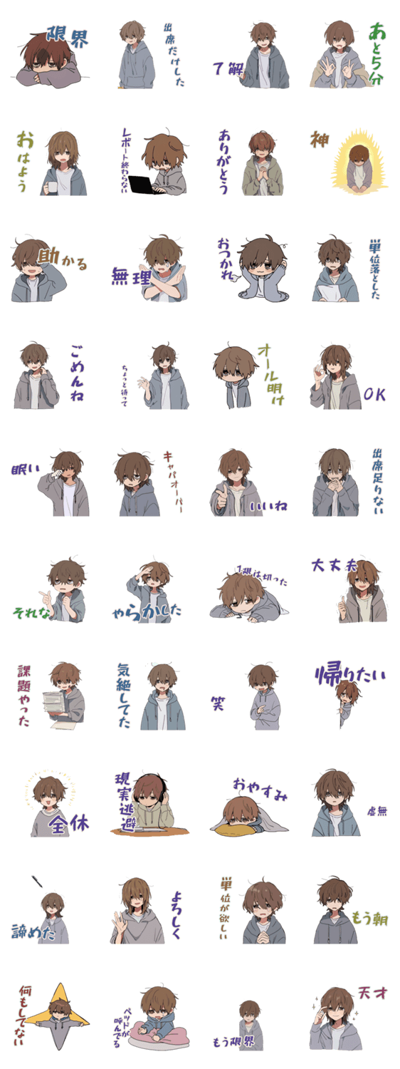 | スタンプ説明 | レポートや単位に追われる限界な男子大学生のスタンプ/日常/毎日/使える/ゆるい/大学生/友達/男子/学生/徹夜/単位/締め切り/可愛い/シンプル/挨拶/癒し |