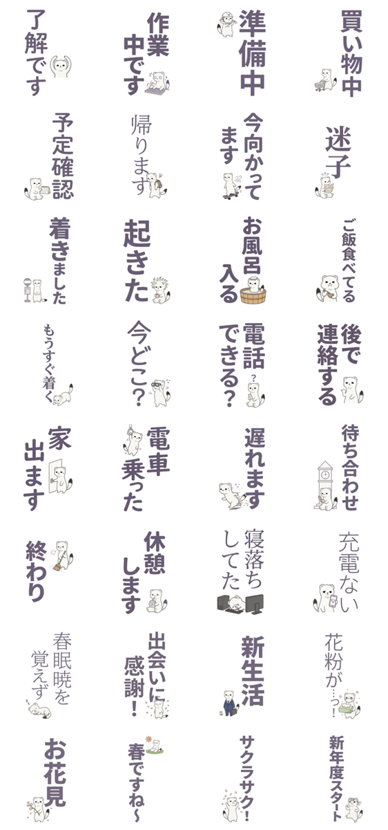 | スタンプ説明 | オタ友との連絡や遠征時に!「電車乗った」「寝落ちしてた」「買い物中」など、文字を打つのが面倒な移動中もポンと押せるオコジョの状況報告セット。推し活の必需品です! ※このスタンプはトークルームで大きく表示されるBIGスタンプです。 |