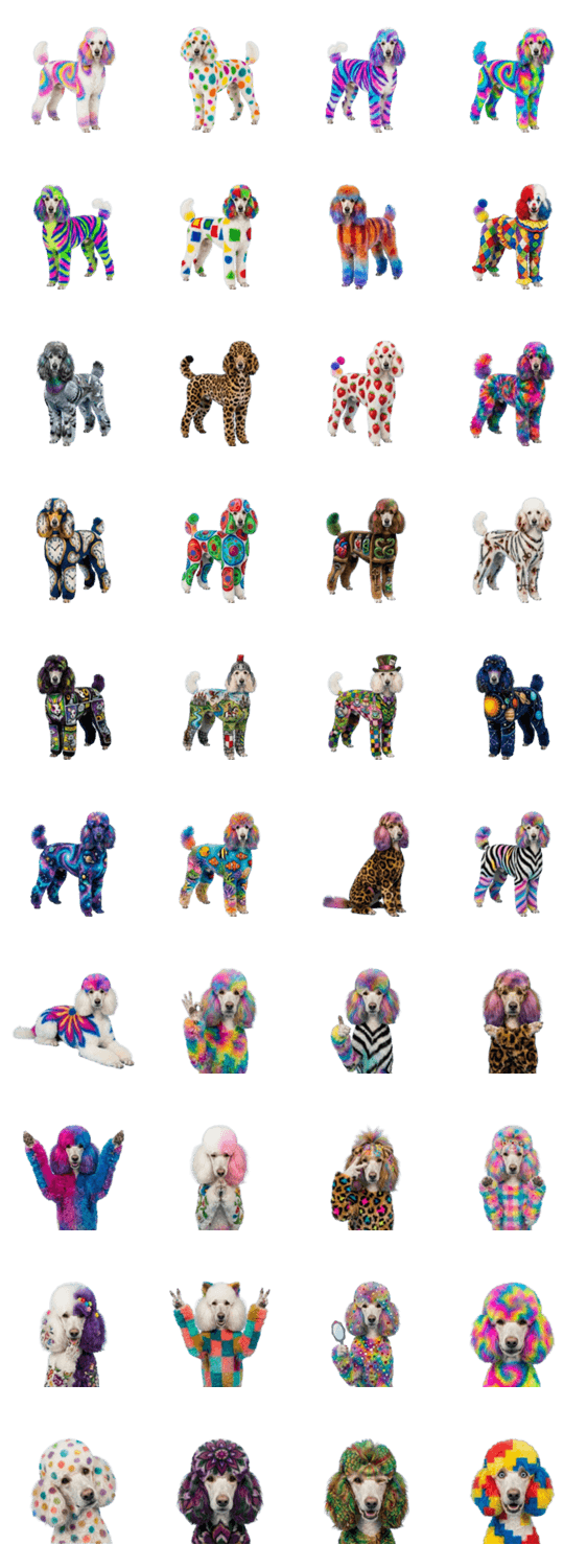 | スタンプ説明 | えげつない毛染めやばいえぐいカラフルで可愛いトイプードルのカラーリング写真。犬ペット動物お洒落派手シュール面白い挨拶日常会話トリミング美容室個性的かわいいゆるい |