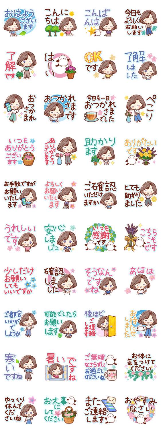 | スタンプ説明 | 大人女子とシマエナガの敬語の大きな文字スタンプです♪ ありがとう/おはよう/おやすみ/よろしく/お願いします/可愛い/笑顔/連絡/PTA/役員/女の子/主婦/ママ友/シニア女性 |