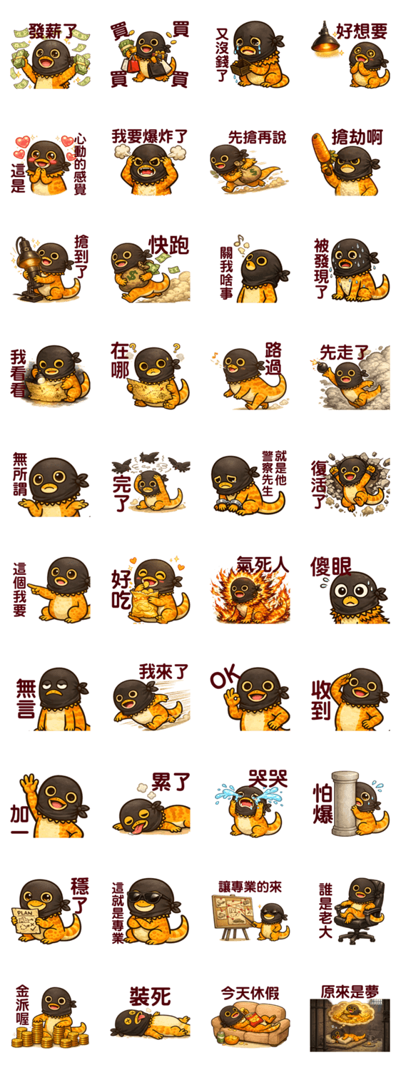 | スタンプ説明 | Funny bearded dragon A-Song becomes a masked bandit! Cute, silly robber moments, running away, sharing loot, and daily emotions for fun chats. |