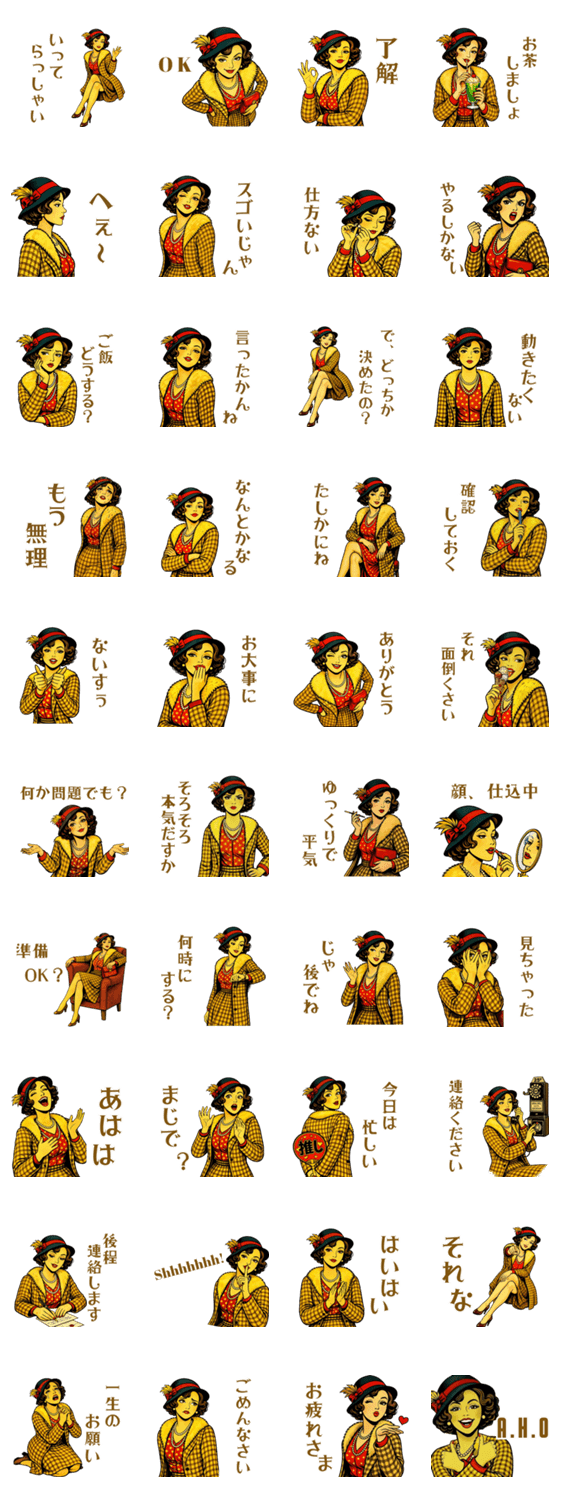 | スタンプ説明 | レトロでおしゃれなモダンガールの毎日使えるスタンプ。 挨拶やリアクション、プライベートまで幅広く使えるセット。 日常のトークをさりげなく彩ります。 |