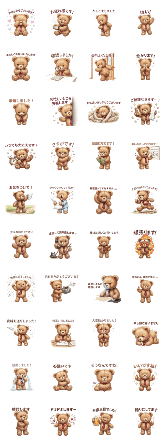 | スタンプ説明 | 【ビジネス敬語】赤いネクタイのクマ「ベアリー」が登場!上司や同僚、取引先への返信にも便利で丁寧な挨拶を厳選しました。お疲れ様など、毎日使える事務連絡も満載です。 |