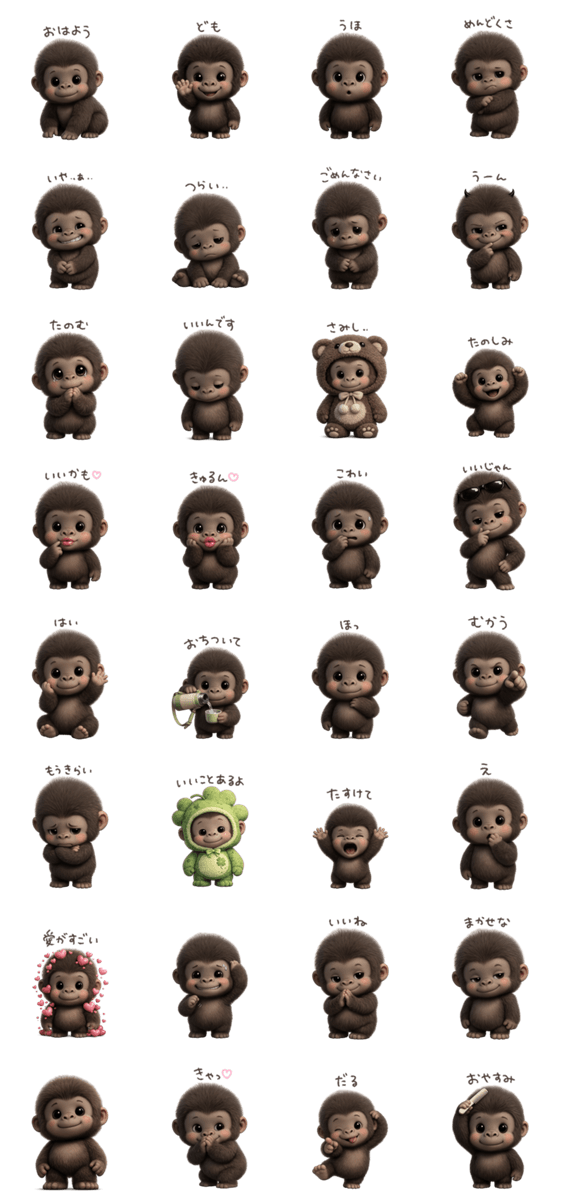 | スタンプ説明 | さすがに可愛すぎるフサフサゴリラです。 ※このスタンプはトークルームで大きく表示されるBIGスタンプです。 |