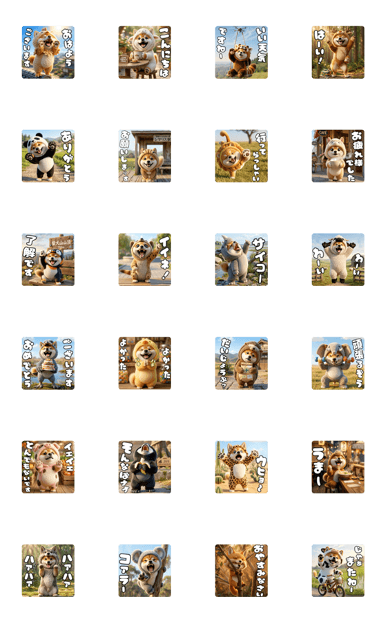 | スタンプ説明 | 【おもしろ特集】柴犬が色んな動物に変身!?パンダやゴリラなど、シュールな着ぐるみ姿に爆笑必至。「持っててよかった」と思える愉快なスタンプです! |