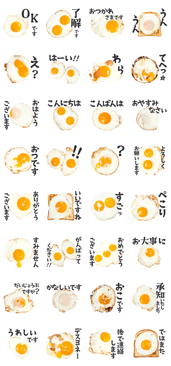 | スタンプ説明 | ウマうま玉子の写真スタンプ。卵大好き飯テロ意味不明中二病返事推し活オタク煽りギャグ面白いネタゆるいだるい。食べ物ご飯友達先輩バイト部活恋人のプレゼントにおすすめ |
