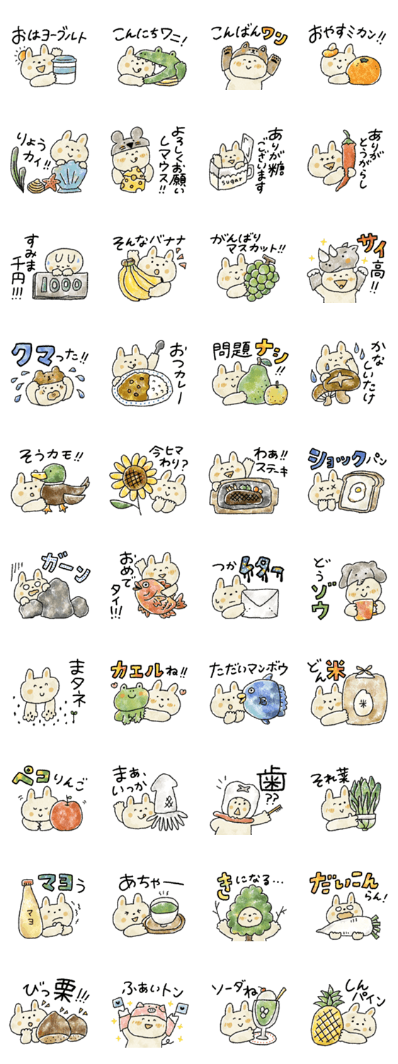 | スタンプ説明 | 毎日使いやすいダジャレスタンプです。だじゃれ好きなうさぎちゃんです。駄洒落/うざカワイイ/ギャグ/ネタ/おもしろ/水彩風/クレヨン風 |