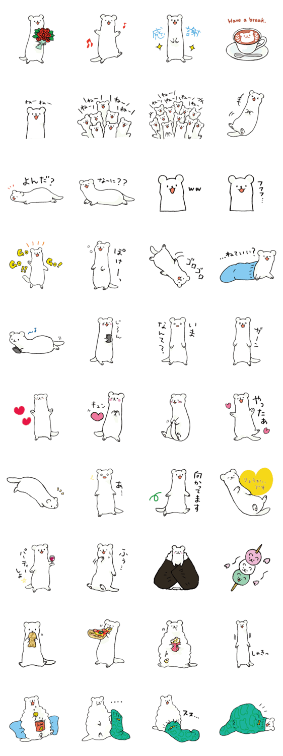 | スタンプ説明 | いたちのベルは食べることが大好きないたちの女の子。小さな体で今日もモグモグ。たまに食べ過ぎちゃうけど気にしない!いつもマイペースなベルのまったりスタンプ第三弾。 |