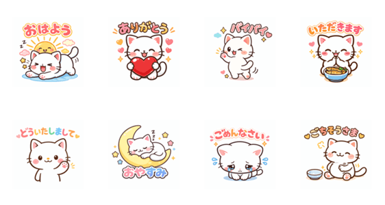 | スタンプ説明 | 可愛い白猫ちゃんが毎日の会話を楽しくしてくれます!あいさつや日常のやりとりにぴったり。 |