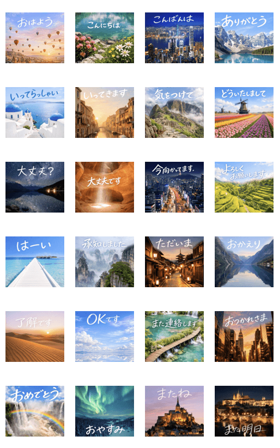 | スタンプ説明 | ドローンで撮影したような世界の絶景と一緒に基本の挨拶をお届けします♡画面いっぱいに広がるポップアップスタンプです。 |