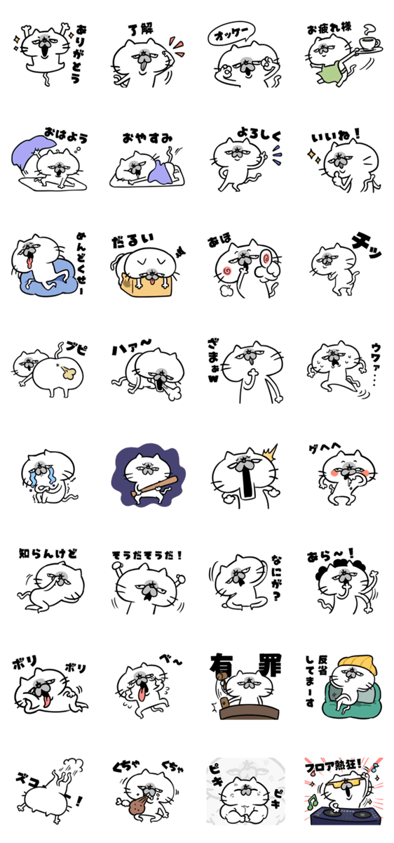 | スタンプ説明 | 脱力感MAX!ブサ猫のだる〜い表情と適当すぎる返事でトークをゆるく盛り上げます。 |