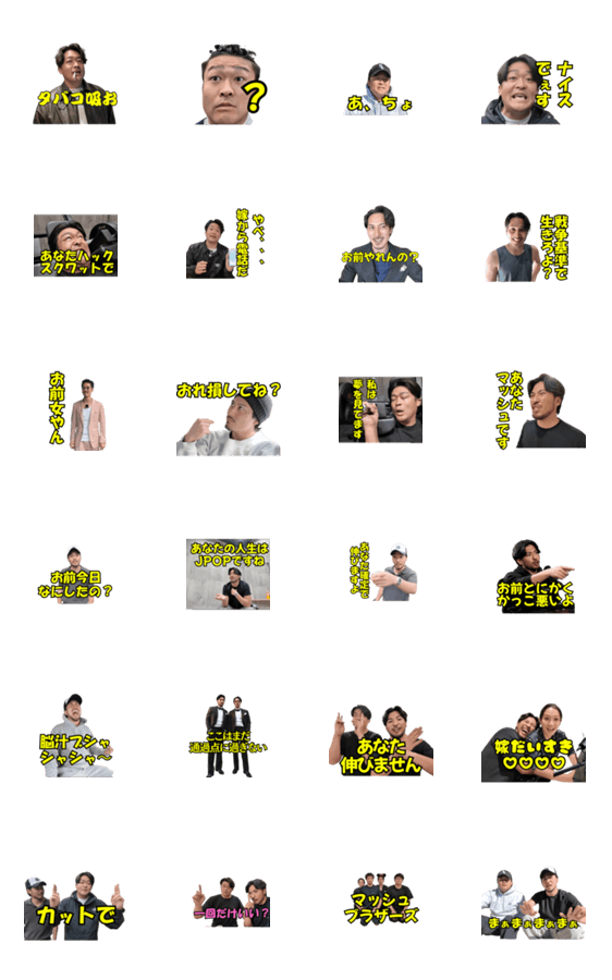 | スタンプ説明 | スーツ兄弟の美学を詰め込んだスタンプ。 仲間との日常も、情けない男への一言も、狙いたいあの子へのアプローチもスマートに決まる。 遊びも色気も、全部この一式に。 |