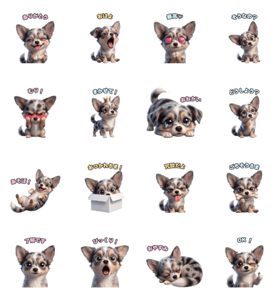 | スタンプ説明 | チワワの愛くるしい表情やしぐさを描いた、日常で使いやすいスタンプ。 挨拶から喜怒哀楽まで、豊富なバリエーションでトークを楽しく彩ります。 自分用にも贈り物にも! |