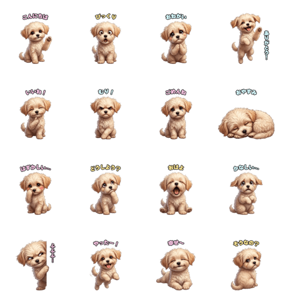 | スタンプ説明 | チワプーの愛くるしい表情やしぐさを描いた、日常で使いやすいスタンプ。 挨拶から喜怒哀楽まで、豊富なバリエーションでトークを楽しく彩ります。 自分用にも贈り物にも! |